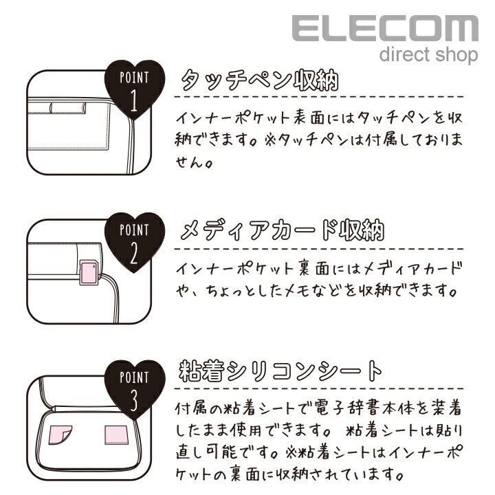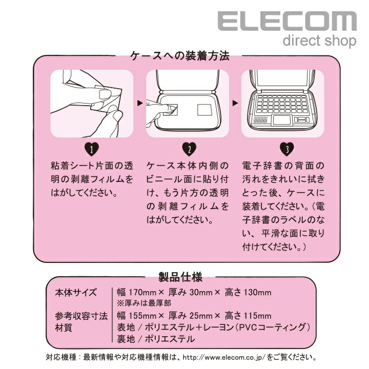 ■外寸:幅170mm×奥行130mm×厚さ30mm ※厚みは最厚部■参考収容寸法:幅155mm×奥行115mm×厚さ25mm■メモリカード収納:○■タッチペン収納:○■ポケット数:メディアカードポケット×2、タッチペン収納ポケット×2■ポケット寸法:メディアカードポケット:幅30mm×高さ30mm/幅70mm×高さ30mm、タッチペン収納ポケット:幅50mm×高さ13mm/幅80mm×高さ13mm■カラー:ホワイト■材質:表地:ポリエステル+レーヨン(PVCコーティング)、裏地:ポリエステル■重量:80gエレコムダイレクトショップハートと手書きメッセージがとってもキュート!汚れにくいビニールコーティング生地を採用した電子辞書ケース”DICT.fem”。
