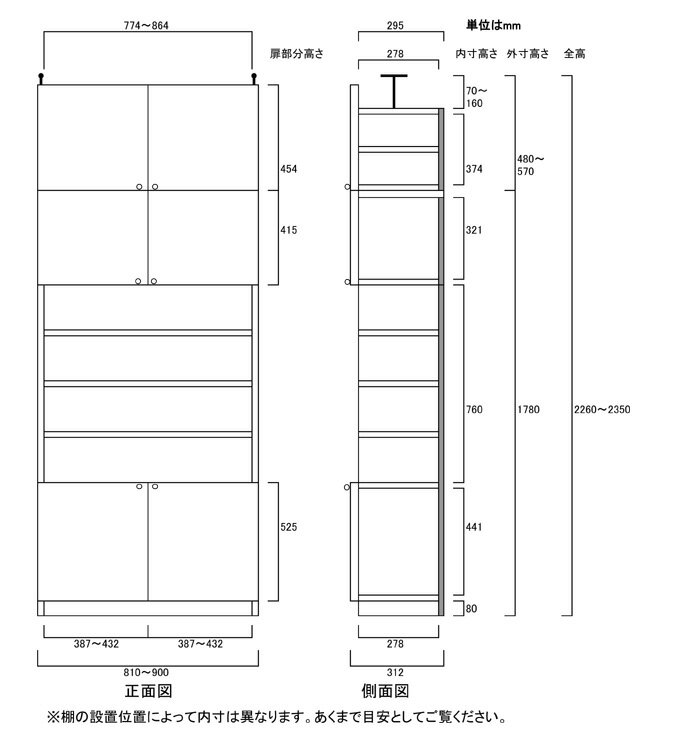 商品仕様 ■棚板タイプ: 厚棚板(厚さ2.5cm)タイプ ■棚板耐荷重: 15kg ■外寸: 奥行31cm×高さ226〜235cm×幅81〜90cm (幅は1cm単位でオーダーできます) ■対応天井高: 226〜235cm (ラック高さ178cm+突っ張り棚高さ41cm+伸縮突っ張り金具) ■棚板枚数 移動固定棚板:7 ■扉枚数:本体棚 上部扉2枚・下部扉2枚、突っ張り棚 2枚 上下共両開き ■本体棚扉サイズ:上扉41.5cm+下扉52.5cm ■付属品: 突っ張り金具・転倒防止補助バンド・扉取付用ヒンジ・取っ手用金具(標準つまみ)・ビス ■外寸(幅): 81cm 82cm 83cm 84cm 84cm 85cm 86cm 87cm 89cm 90cm 共通仕様 ■材質: プリント化粧繊維板 ■塗装: ウレタン樹脂塗装 ■素材: ホルムアルデヒドの発生を最小限に抑えた基材・芯材・プリント紙・接着剤(F☆