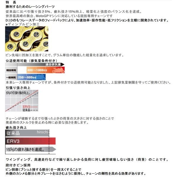 D.I.D 大同工業 チェーン 520ERV3 レース用 ERシリーズチェーンサイズ:520リンク数:(106L)シールタイプ:X-Ringジョイントタイプ:ZJ(カシメ)カラー:ゴールド520ERV3は多くのワークスチームに供給している物と同スペックのハイクオリティレーシングチェーンです。