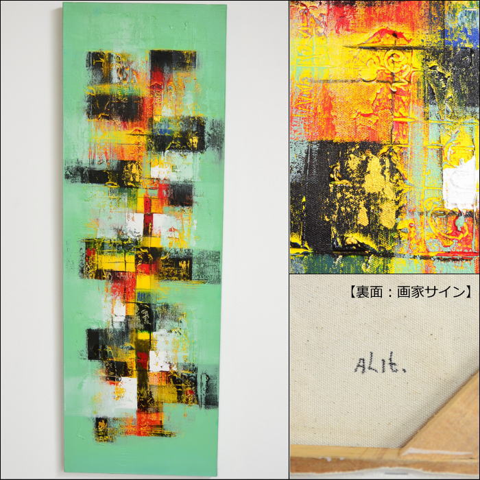 【 素材 】 キャンバス、天然木 【 サイズ 】短辺 50cm × 長辺 150cm × 厚み 4cm 重さ 2.1kg 画家さんのサインの向きによって紐の向きは決めておりますが、 押しピン等を枠に引っ掛けて好きな向きでもお楽しみいただけます。