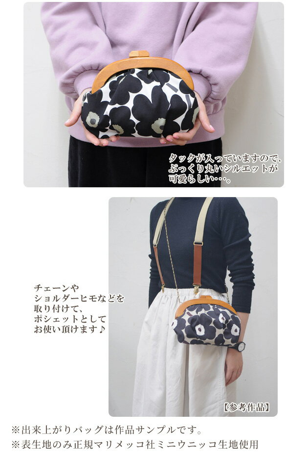 (別途お買い求めください)【商品詳細】■セット内容・表生地、マリメッコ生地(ブラック)・裏生地 シーチング生地・木のがま口・中厚芯・レシピ(本書+型紙)■サイズ画像にてご確認ください。