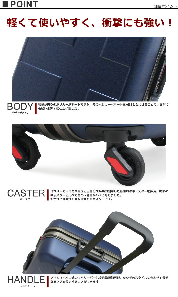 サイズ 総外寸:約W44×H66×D26cm外寸:約W40×H58×D26cm重量:約4.0kg容量:約60L カラー NAVY/REDWHITE-TRICOBLUE-TRICO 滞在目安 約3〜5日 素材 ポリカーボネート+ABS 仕様 ハードキャリー フレームタイプ4輪消音キャスター(日乃本製サイレントラン)キャリーバー4段階調節可能TSAカードロック搭載内装(フタ側):クロスベルト×1、中仕切り(ファスナーポケット付き)×1内装(本体側):クロスベルト×1、中仕切り(ファスナーポケット×2) 付属 カードキー×2トートバッグ×1ポーチ×1ハンガー×1 備考 2年保証お急ぎでの納期・在庫の確認につきましては、お電話にてお問い合わせ下さい。